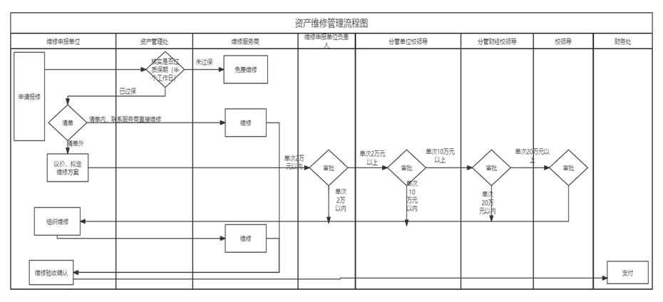 2.清单外的维修,由维修申报单位联系维修商议价后,拟定维修服务商、维修金额和经费渠道,按以下程序报批:2万元以下,部门(学院)负责人审核签字;2万元(含)-10万元,分管校领导加签;10万元(含)-20万元,分管财经校领导加签,20万元(含)以上,校长加签。